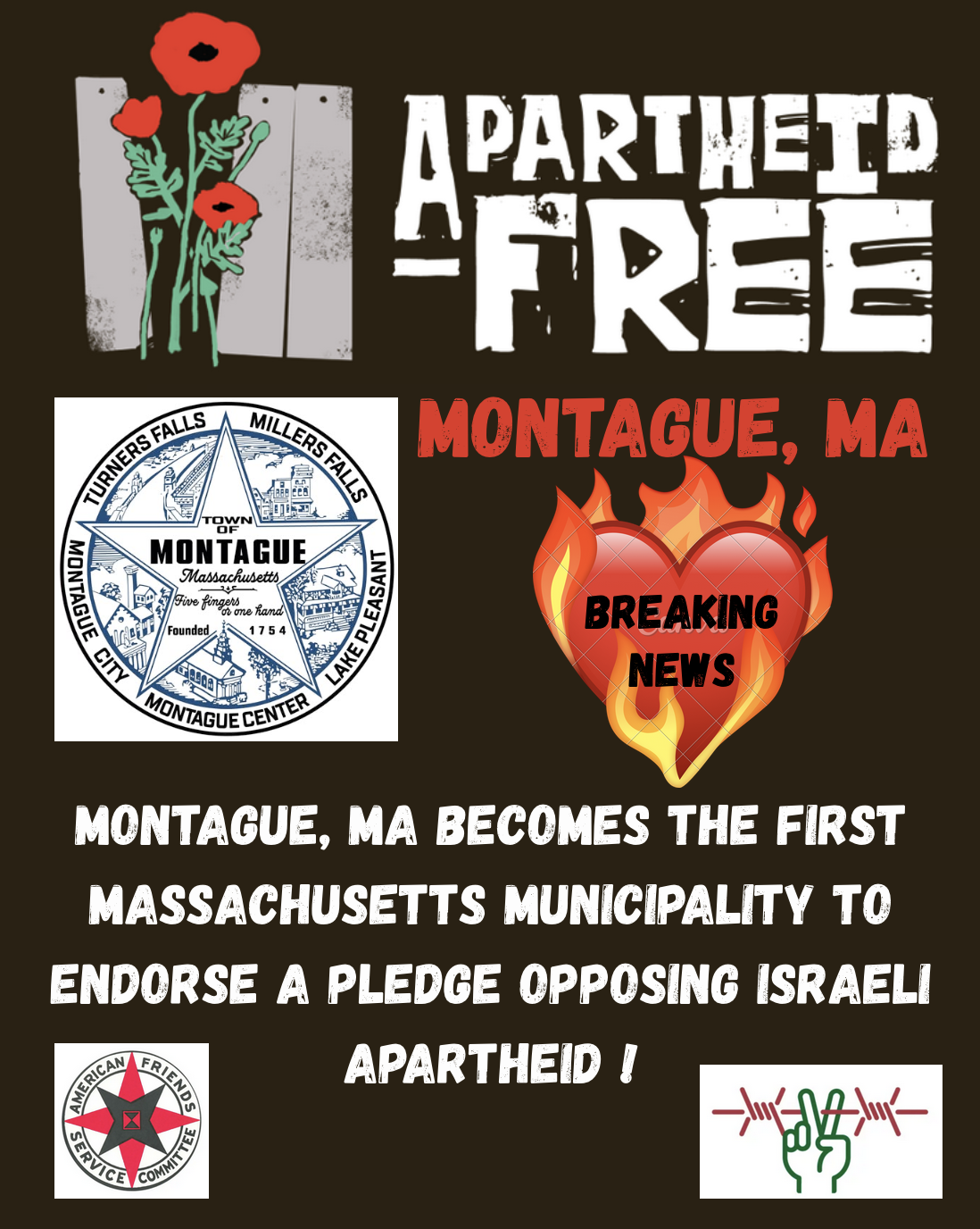 On October 22, 2025, voters at the Special Town Meeting in Montague, MA voted to declare the Montague municipality to be an Apartheid-Free community. The campaign continues with Montague residents working towards fulfilling the pledge!